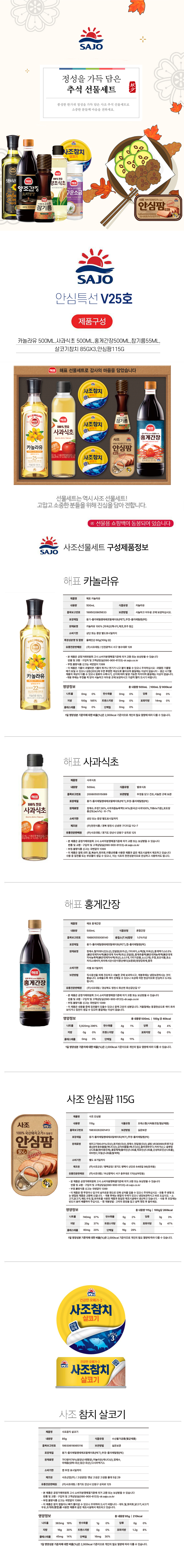 Ä«³î¶óÀ¯500ml x 1°³ + »ç°ú½ÄÃÊ500ml x 1°³ + »ìÄÚ±âÂüÄ¡85g x 3°³ + ¾È½ÉÆÊ115g x 1 °³ + °í¼ÒÇÑÂü±â¸§55ml x 1°³ + È«°Ô°£Àå500ml x 1°³